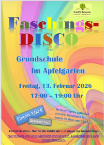 Der Schulförderverein lädt alle Kinder der Grundschule Im Apfelgarten zur Faschings-Disco am Freitag, 13.02.2026 von 17-19 Uhr in die Schule ein.